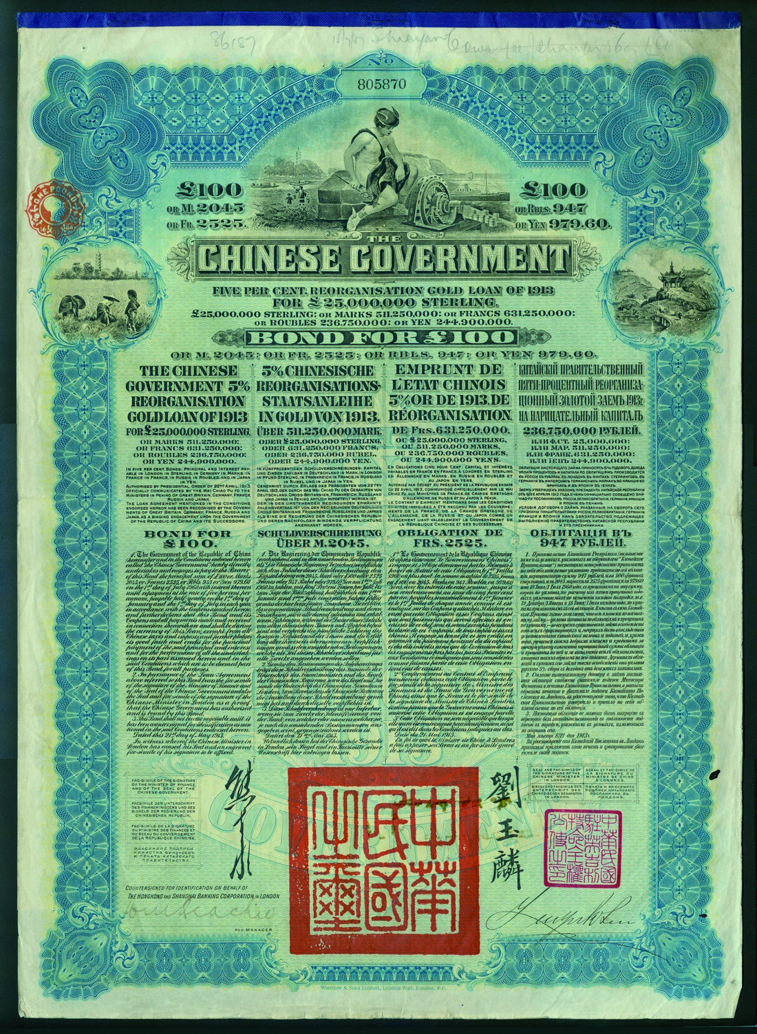 1913 5% Reorganisation Gold Loan, 1x 20pounds, 1913 brown, Mercury at top, HSBC issue and 1x 100pounds, blue, Mercury at top, HSBC issue, crisp very fine (2)