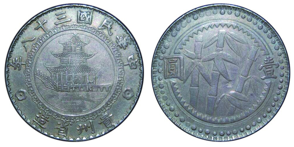 China, Kweichow Province, Silver Dollar, 1949, Bamboo Dollar, 'Oval Window Variety', classic design and an extremely rare variety. Even grey toning throughout both the obverse and reverse surfaces, no scratches of rim damage. Ex E. Kann PCGS XF45, unique in the population and extremely rare