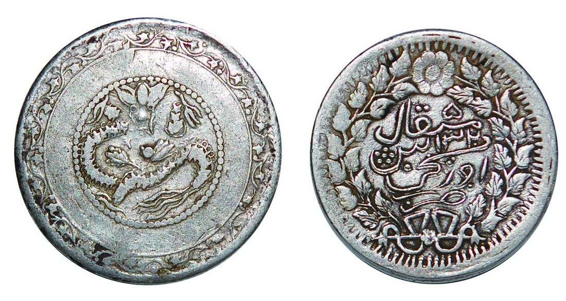 China, Sinkiang Province, 5 miscals, Guangxu era, struck for Dihua and also 5 misclas, Xuantong era, struck for Kashgar, both cleaned, good VF for types