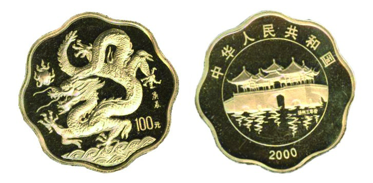 China, People's Republic Gold 100yuan, 2000, Lunar Horoscope series, dragon chasing fireball on obverse, the reverse shows the Five Pavilion Bridge in Yangzhou, in original box and certificate, mintage of 2300, proof