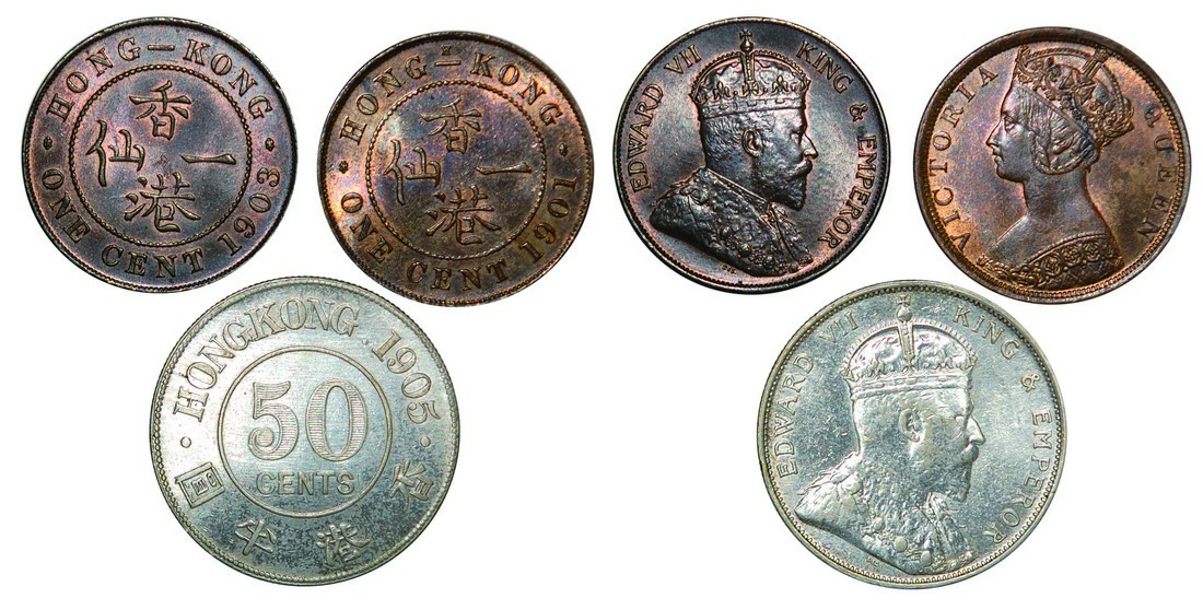 Hong Kong, lot of 3: 1cent 1901-H and 1903, 50cents 1905, the first two are uncirculated, the 50cents good extremely fine (3)