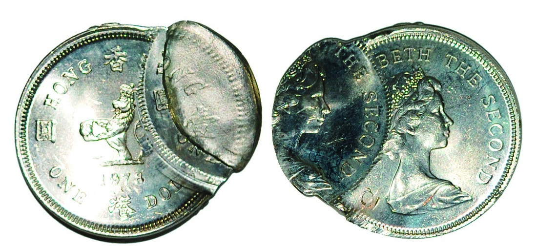 Hong Kong, $1, 1978, spectacular error, in which the planchet is welded from parts of two coins or at double struck so that two obverses and two reverses are seen, such prominent errors are rare, uncirculated