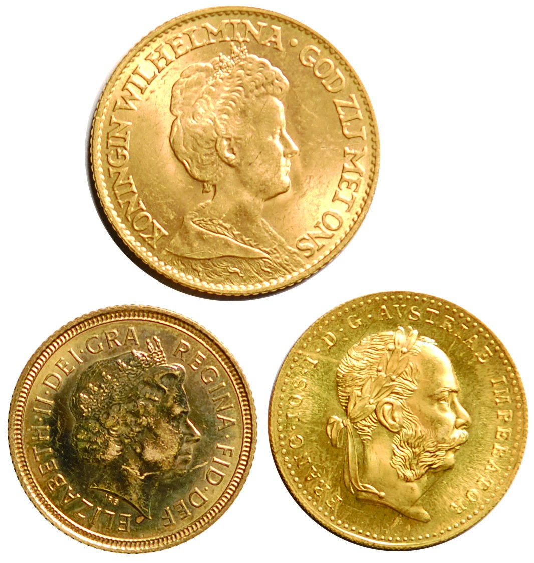 World Gold, lot of 3 coins; Austria-Hungary 20 corona, 1915 (restrike), Netherlands 10gulden, 1917 and United Kingdom Half Soverign, 2000, all in uncirculated condition