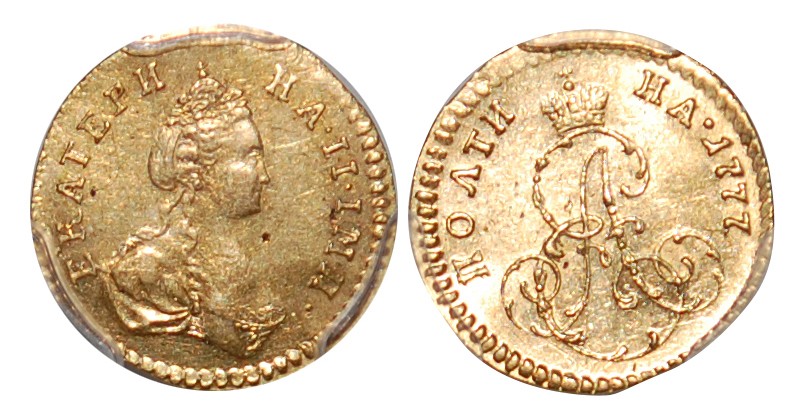 Russia, Catherine II (1762-1796), gold Poltina (1/2 rouble), 1777, initials on obverse, bust of Catherine II facing right on reverse, (KM 75), unknown mintage, PCGS AU55, scarce