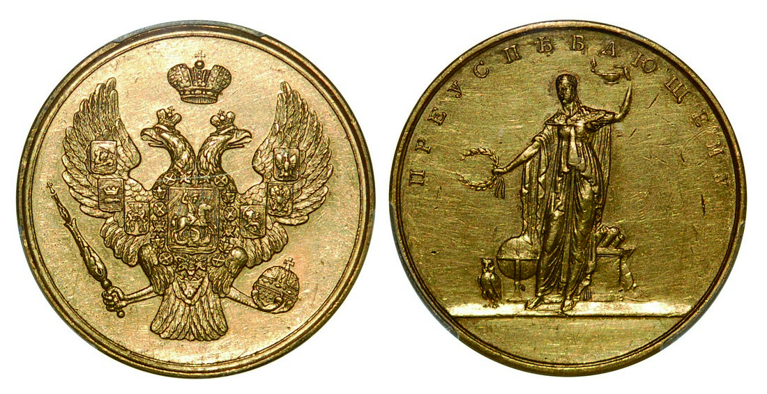 Russia, gold medal intended for the students of the men's gymnasium, royally approved in 1835, Russian coat of arms on obverse, standing Minerva on reverse, left upraised arm holding the lantern, Laurel wreath in right hand, owl and the attributes of science (scrolls and the globe) at her feet, most medals are silver, whilst gold is extremely scarce,