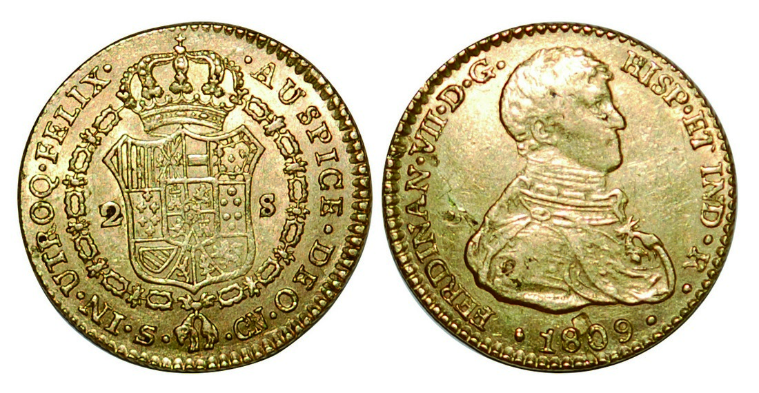 Spain, Ferdinand VII (1808-1833) gold two escudos, 1809, Seville mint, crown and shield at centre, legend around edge, wide armoured, bare head bust of Ferdinand on reverse (KM 143a), very fine, some lamination peeling on reverse, rare