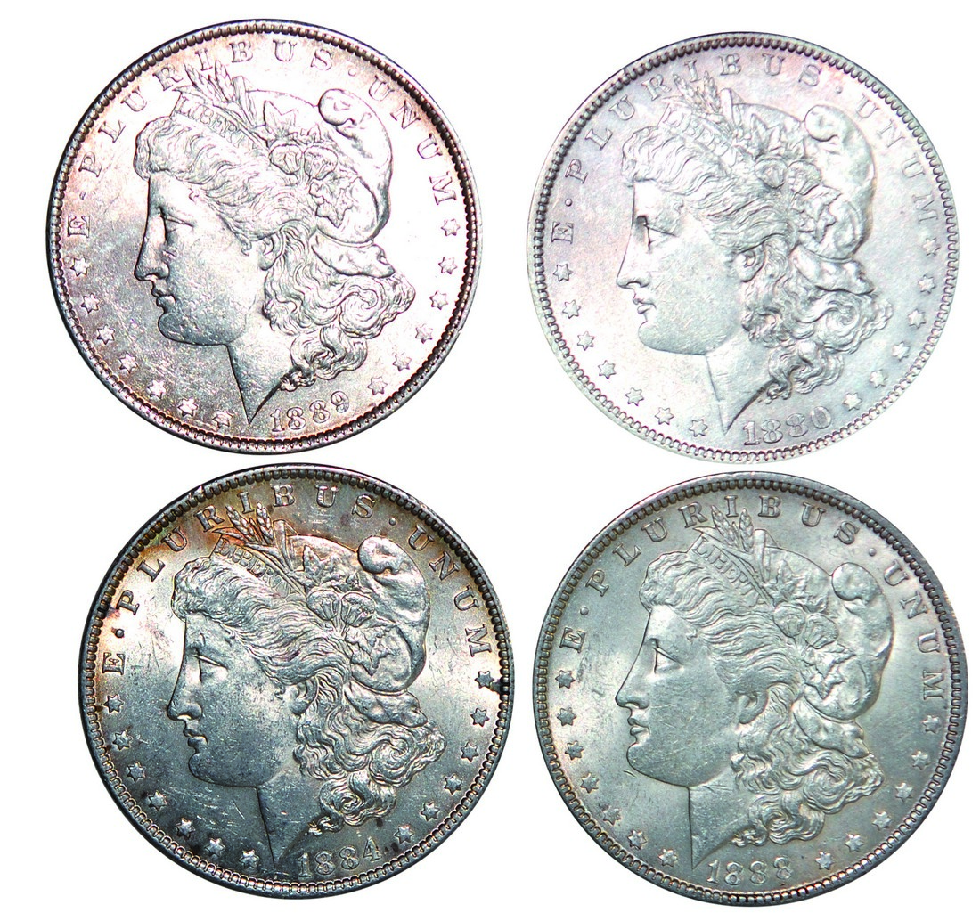 United States, Silver Morgan Dollars, 1880-O, 1884, 1888 and 1889, extremely fine to almost uncirculated