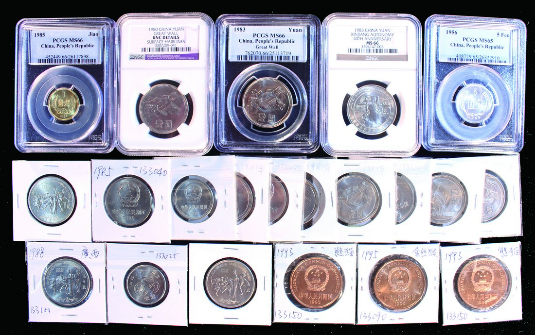 China, People's Republic, a lot of 21 silver and copper coins, including 1 Yuan, 1981(7), 1985, 1988(3), 1991(2), Great Wall and other themes, 5 Yuan, copper, 1993(2), 1995, Panda and Monkey, and 5 PCGS and NGC encapsulated 5-Fen to I Yuan coins, all uncirculated(21)