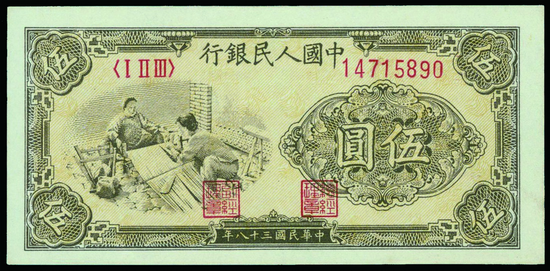 People's Bank of China, 1st series renminbi, 5yuan, 'Weaving', 1949, serial number I II III 14715890, (Pick 813), uncirculated