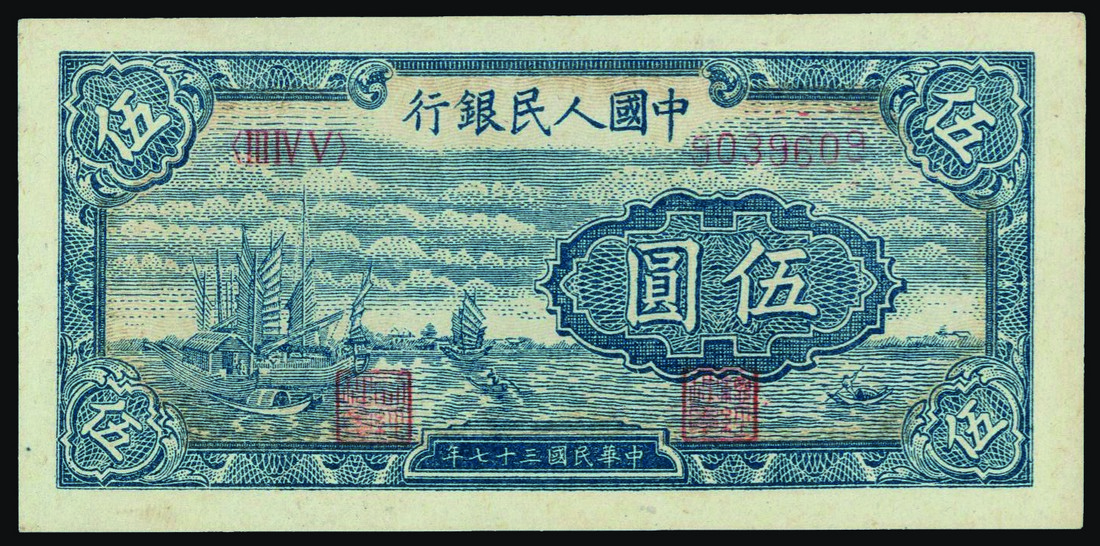 People's Bank of China, 1st series renminbi, 5yuan, 'Small Junk', 1949, serial number 9039609, (Pick 801), uncirculated