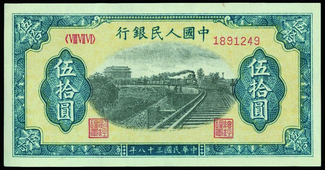 People's Bank of China, 1st series renminbi, 50yuan, 'Railway', 1949, serial number VIII VII VI 1891249, (Pick 829), uncirculated