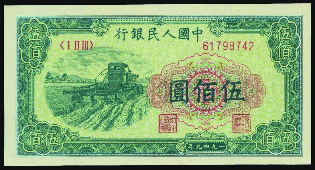 People's Bank of China, 1st series renminbi, 500yuan, 'Tractor', 1949, serial number I II III 61798742, (Pick 846), uncirculated