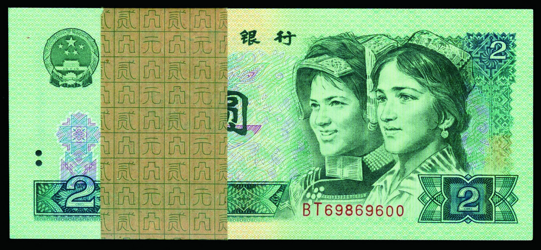 People's Bank of China, 4th series renminbi 2yuan, 1990, red serial number BT69869501 green and multicoloured, two girls at right, coastal scene on reverse, minor error in that the bottom serial number is slightly shifted upwards on about 80 notes.