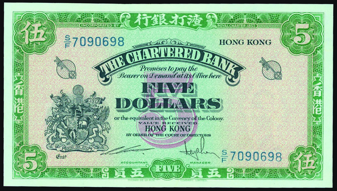 The Chartered Bank $5, no date (1962-70), blue serial number S/F 7090698 green, black and red, coat of arms at bottom left, red '5' at centre, keys top left and right