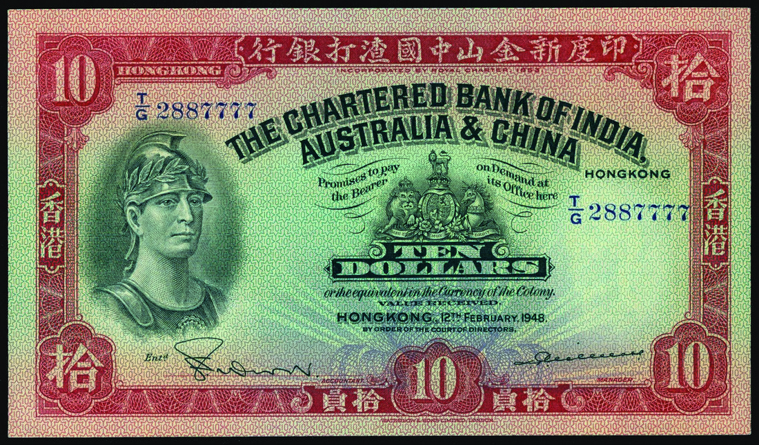 The Chartered Bank of India, Australia and China, $10, 12.2.1948, blue serial number T/G 2887777 red, green and black, helmeted warrior at left, coat of arms centrally, rice planting scene on reverse,
