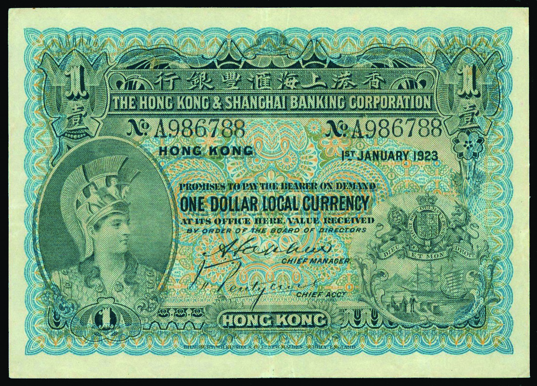 Hong Kong and Shanghai Banking Corporation, $1, 1.1.1923, black serial number A986788, blue, black and multicoloured, floral border, helmeted warrior at left, coat of arms bottom right, reverse brown and pink, allegorical figure playing a harp at centre