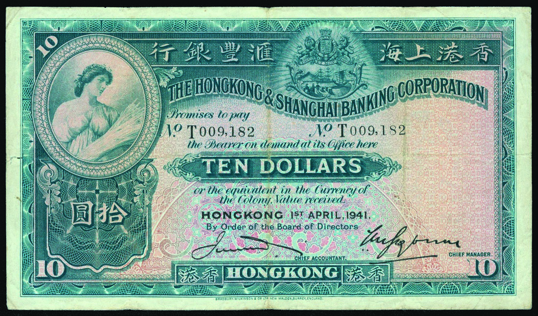 Hong Kong and Shanghai Banking Corporation, $10, 1.4.1941, black serial number T009182, green and multicoloured, maiden with harvest top left, coat of arms top centre, reverse green and multicoloured, angel at top and bank building at centre,