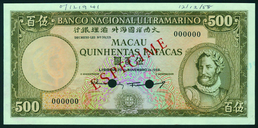 Banco Nacional Ultramarino, 500 pataca specimen, 20 November 1958, serial number 000000, dark green and multicoloured, vignette at bottom, Luis de Cameos at right, reverse green, with maiden watching a ship,