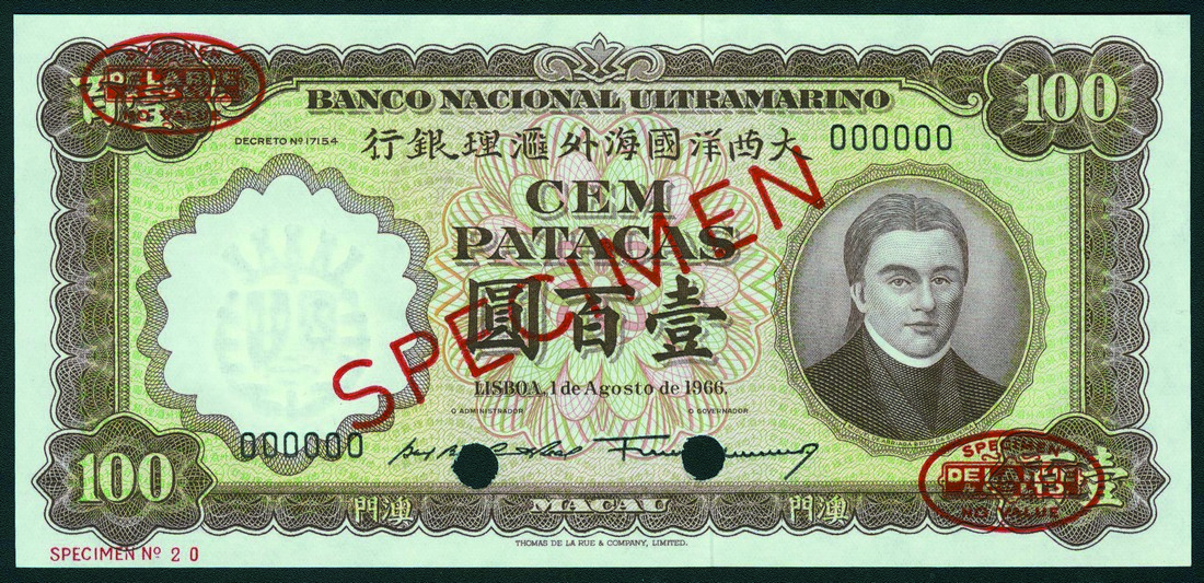 Banco Nacional Ultramarino, 100 pataca specimen, 1 August 1966, brown and multicoloured, da Silveira at right, reverse brown and green, gateway at centre
