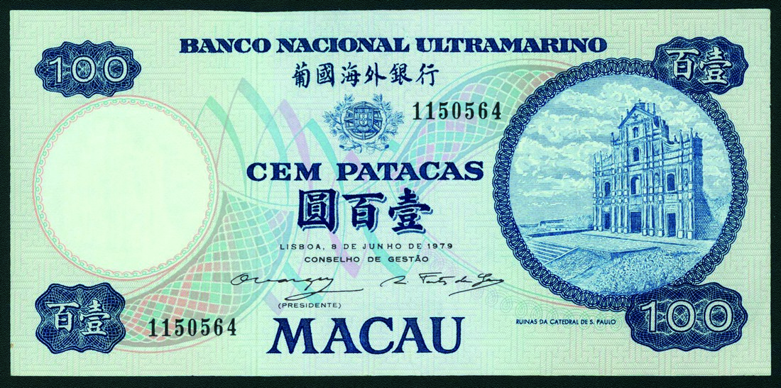 Banco Nacional Ultramarino, 100 patacas, 8 June 1979, serial number 1150564, blue on multicolour underprint, ruins of S. Paulo Cathedral at right,