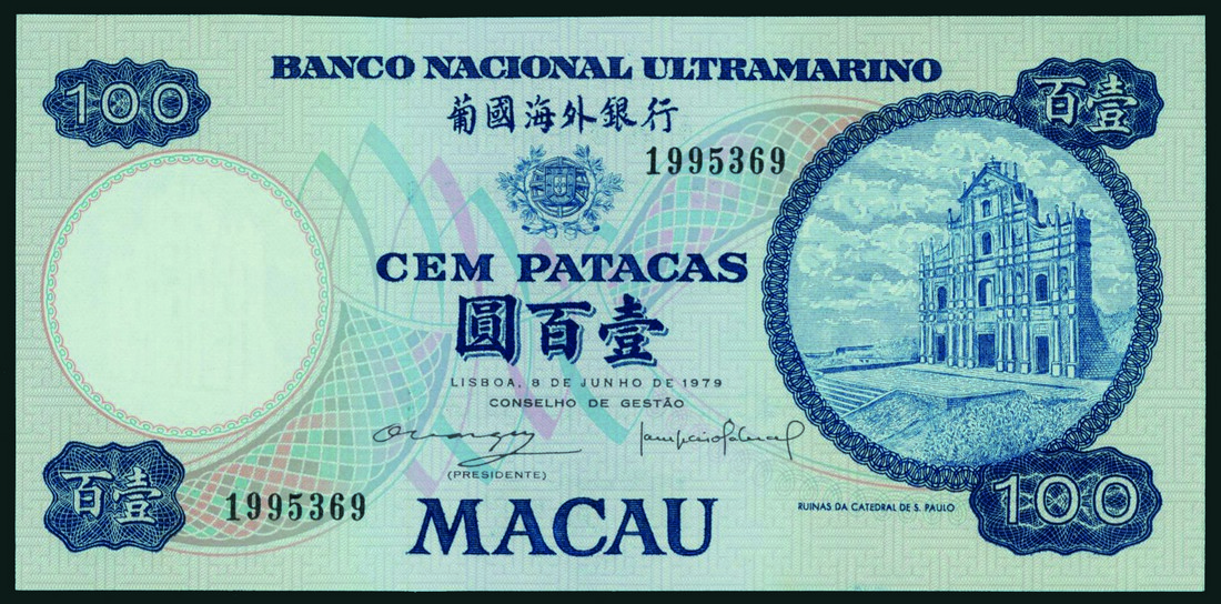 Banco Nacional Ultramarino, 100 patacas, 8 June 1979, serial number 1995369, blue, arms top centre, the Cathedral of Saint Paul at right, reverse blue, ship seal at centre, junk at left