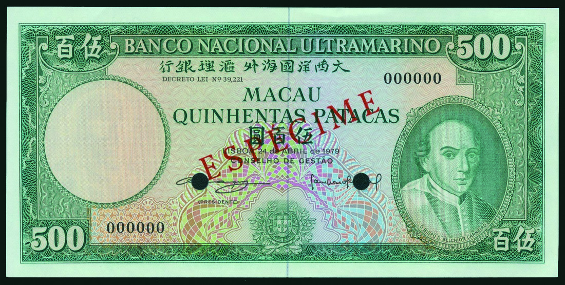 Banco Nacional Ultramarino, 500patacas, 1979, black serial numbers '000000', green and multicoloured, Carneiro at right, coats of arms lower centre, watermark at left, reverse green, ship and maiden at centre, ship seal at left,