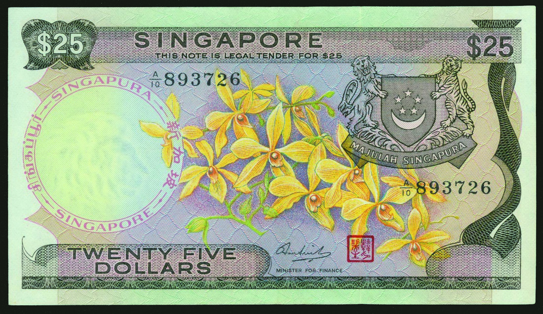 Singapore, $25, no date (1972), black serial number A/10 893726, brown and yellow, 'Orchid 'series,