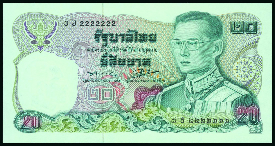Thailand, 20baht, 1981, lucky serial number 3J 2222222, green and multicoloured, King Rama IX at right, statue of King Chulalongkom on reverse