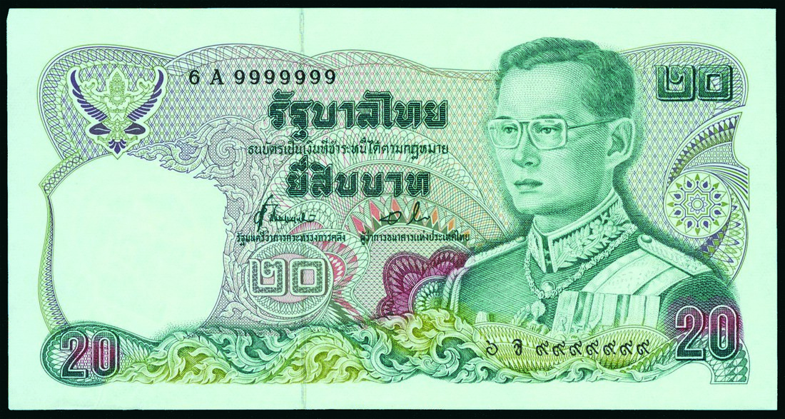 Thailand, 20baht, 1981, lucky serial number 6A 9999999, green and multicoloured, King Rama IX at right, statue of King Chulalongkom on reverse