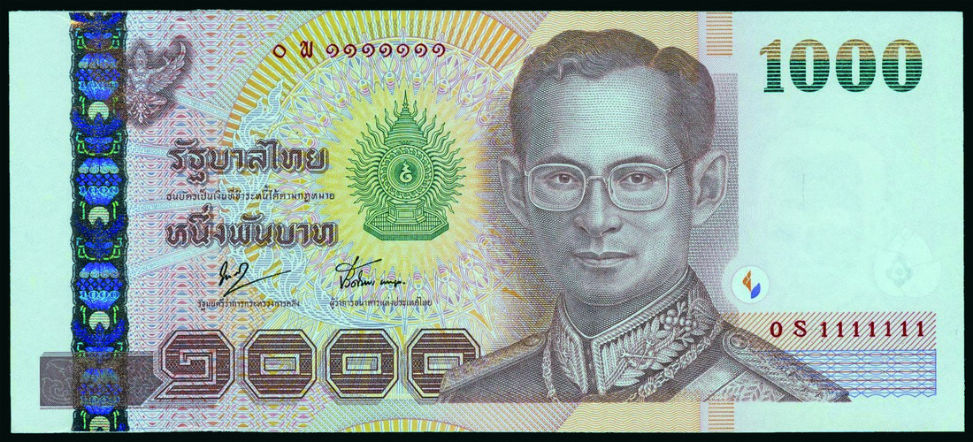 Thailand, 1000baht, 2000, lucky serial number 0S 1111111, brown and multicoloured, King Rama IX at right, King with camera at right on reverse