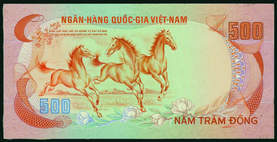 South Vietnam, a hand executed essay on board for a proposed issue for 500dong, (1968?), obverse only, depicting three galloping horses