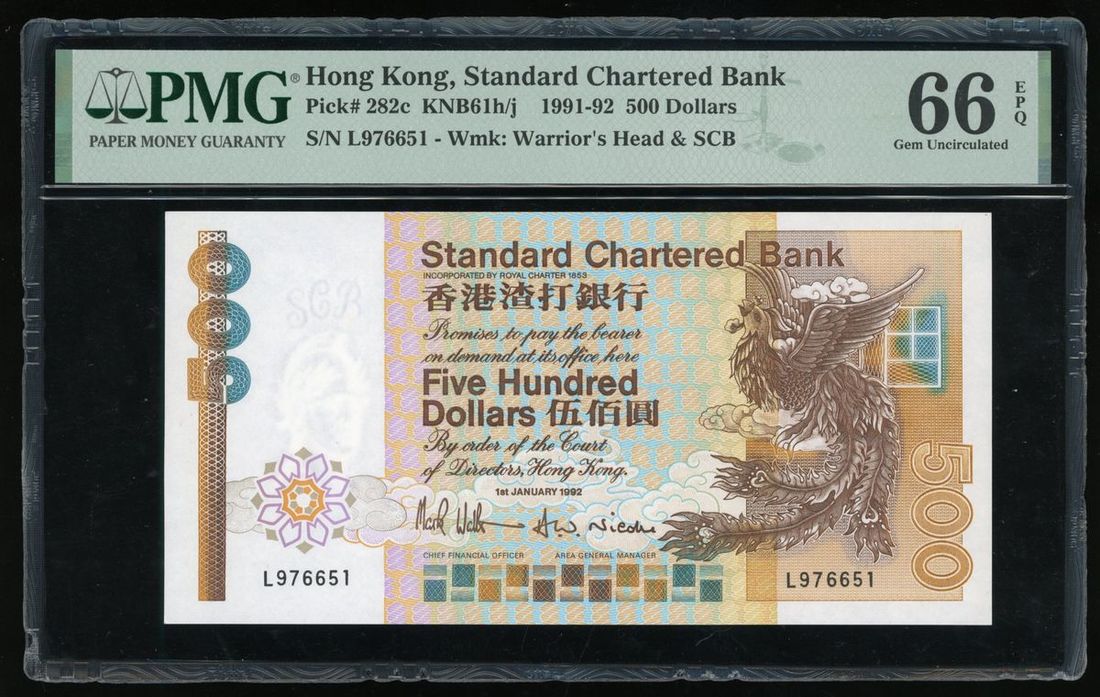 Standard Chartered Bank, Hong Kong, $500, 1.1.1992, serial number L976651, (Pick 282c), PMG 66EPQ. Third highest grade example on PMG Census. Popular type