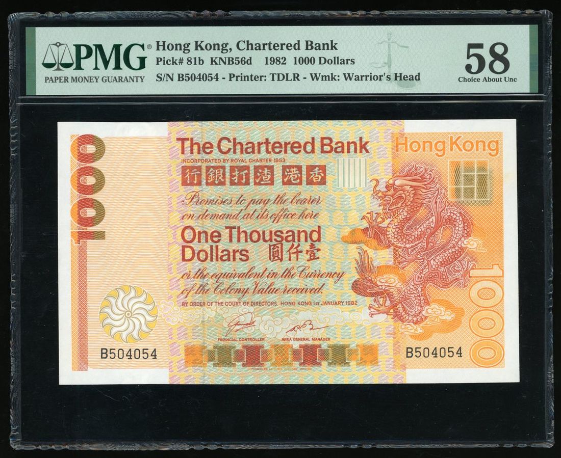The Chartered Bank, Hong Kong, $1000, 1.1.1982, serial number B504054, (Pick 81b), PMG 58 Choice About Unc