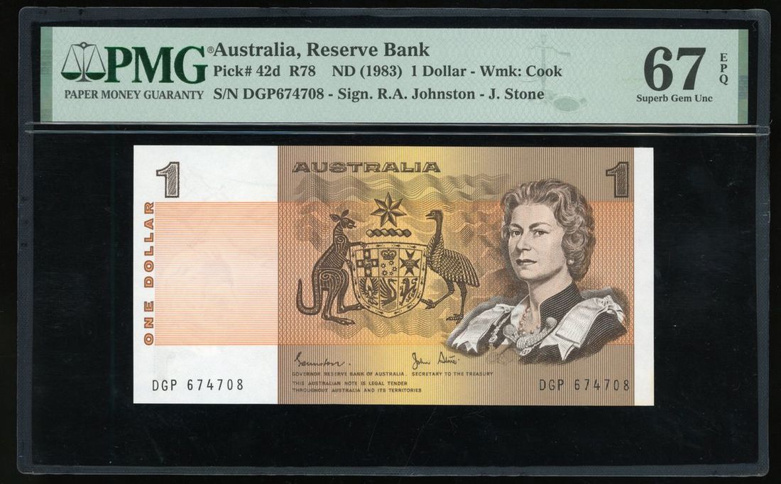 Reserve Bank of Australia, $1, ND (1983), serial number DGP674708, (Pick 42d), PMG 67EPQ Superb Gem Uncirculated