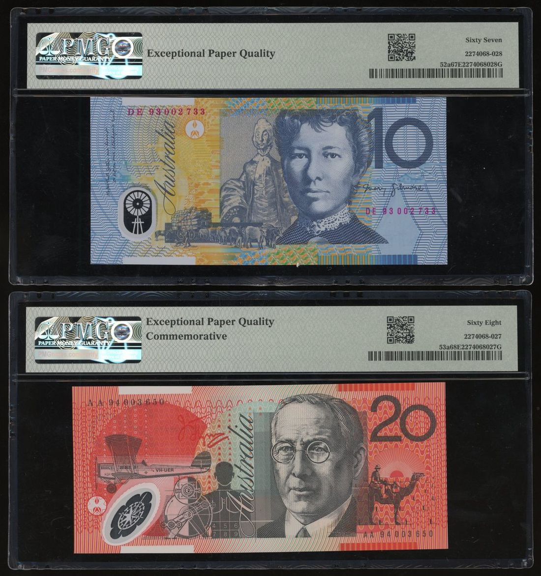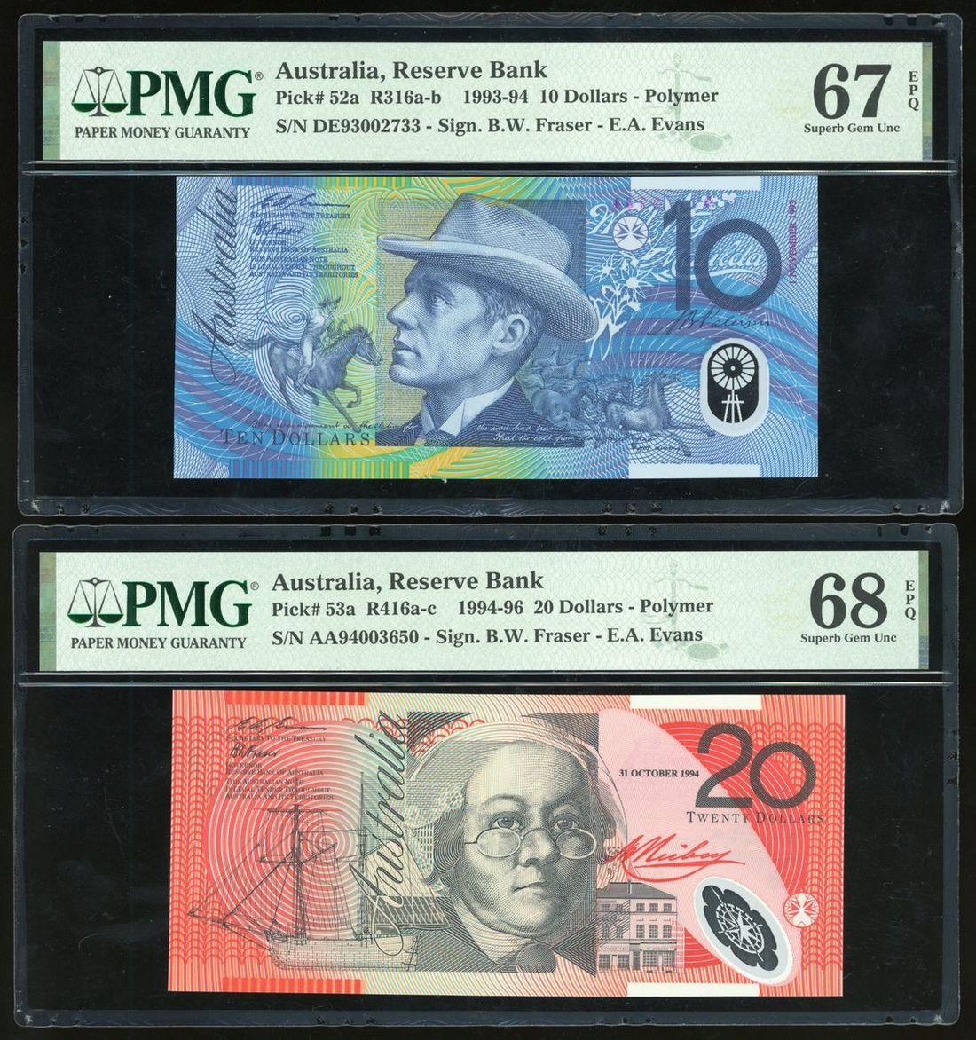 Reserve Bank of Australia, a pair of polymer, including $10 1993, $20 1994, (Pick 52a, 53a), PMG 67EPQ, 68EPQ respectively (2)