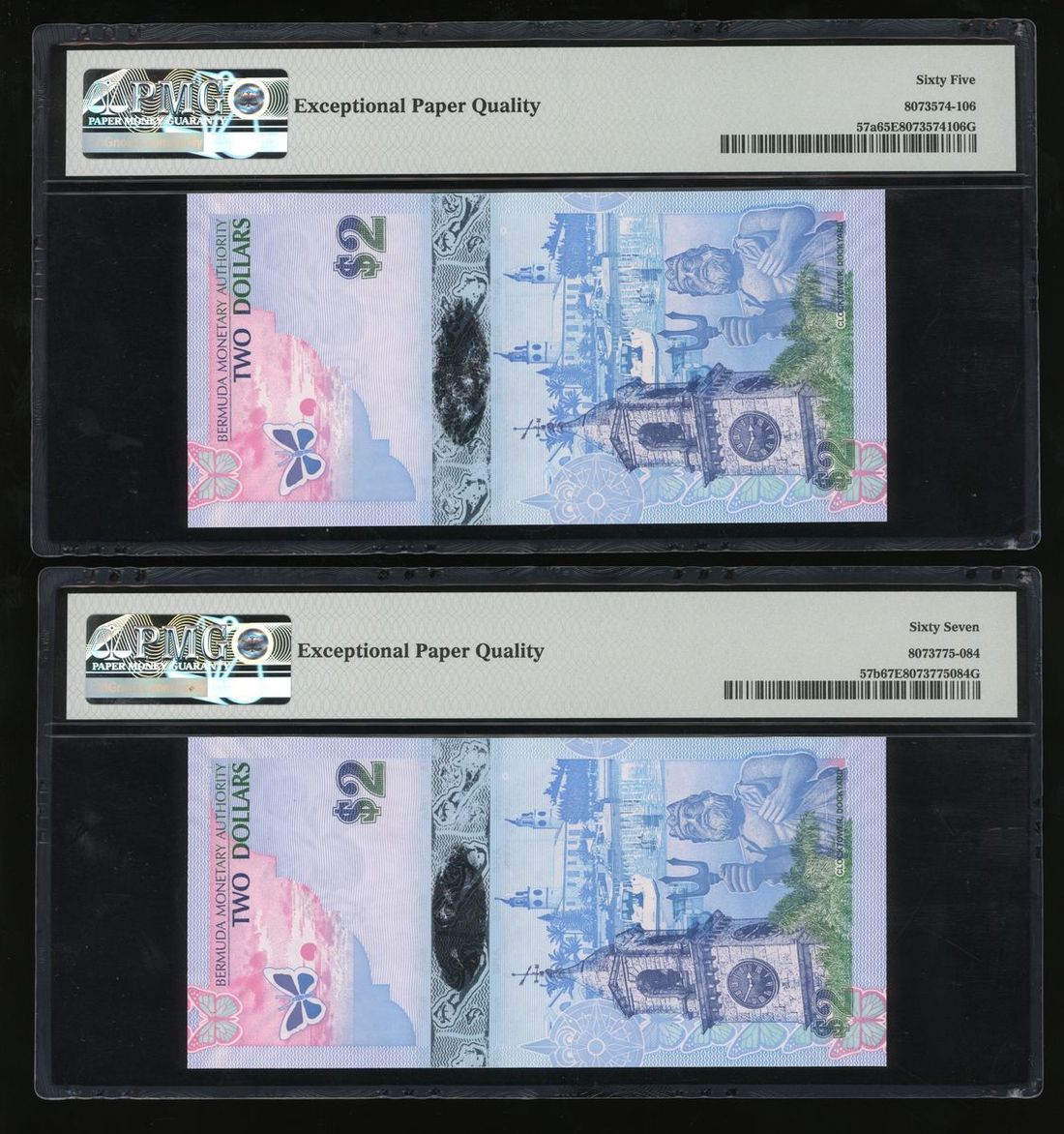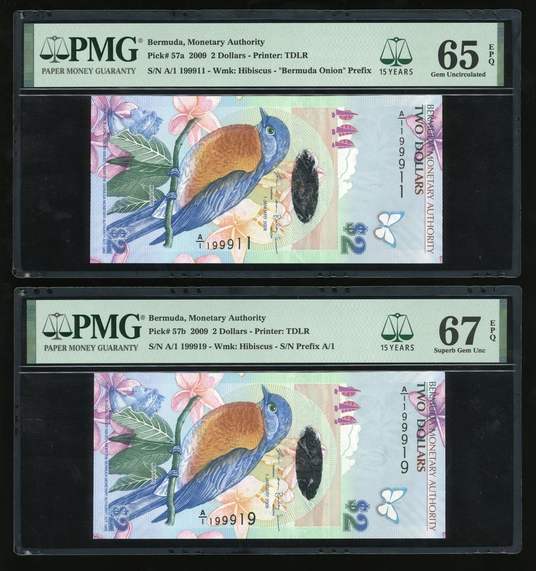 Bermuda, Monetary Authority, a pair of $2, 2009, serial numbers A/1 199911 and A/1 199919, (Pick 57b), graded PMG 65EPQ and 67EPQ respectively, the first note is mislabelled as Pick 57a (2)