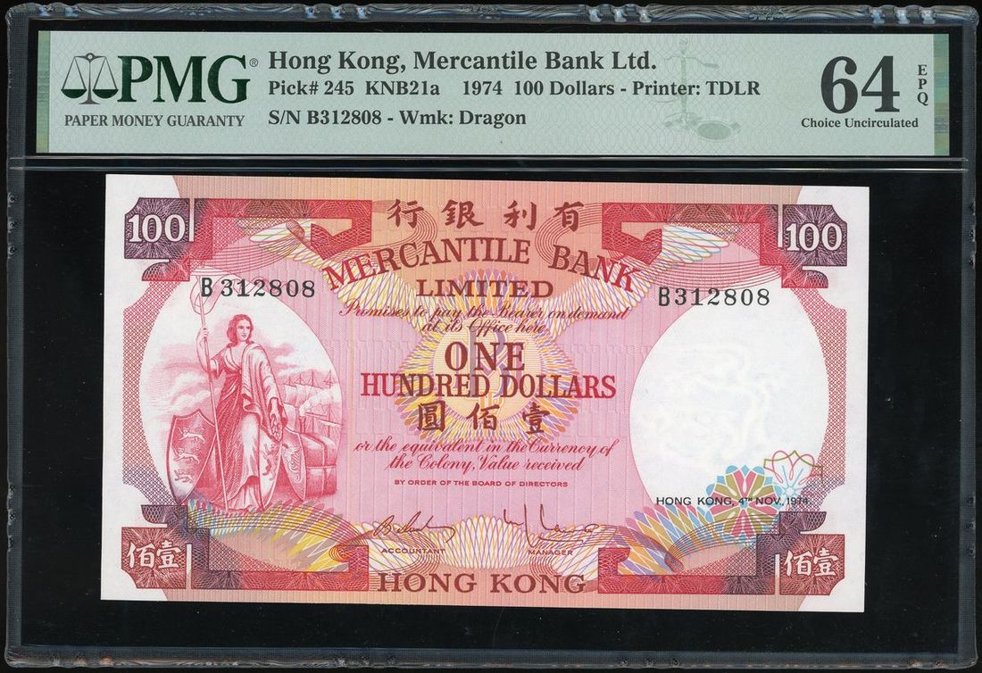 Mercantile Bank Limited, Hong Kong, $100, 4 November 1974, serial number B213808, (Pick 245), PMG 64EPQ