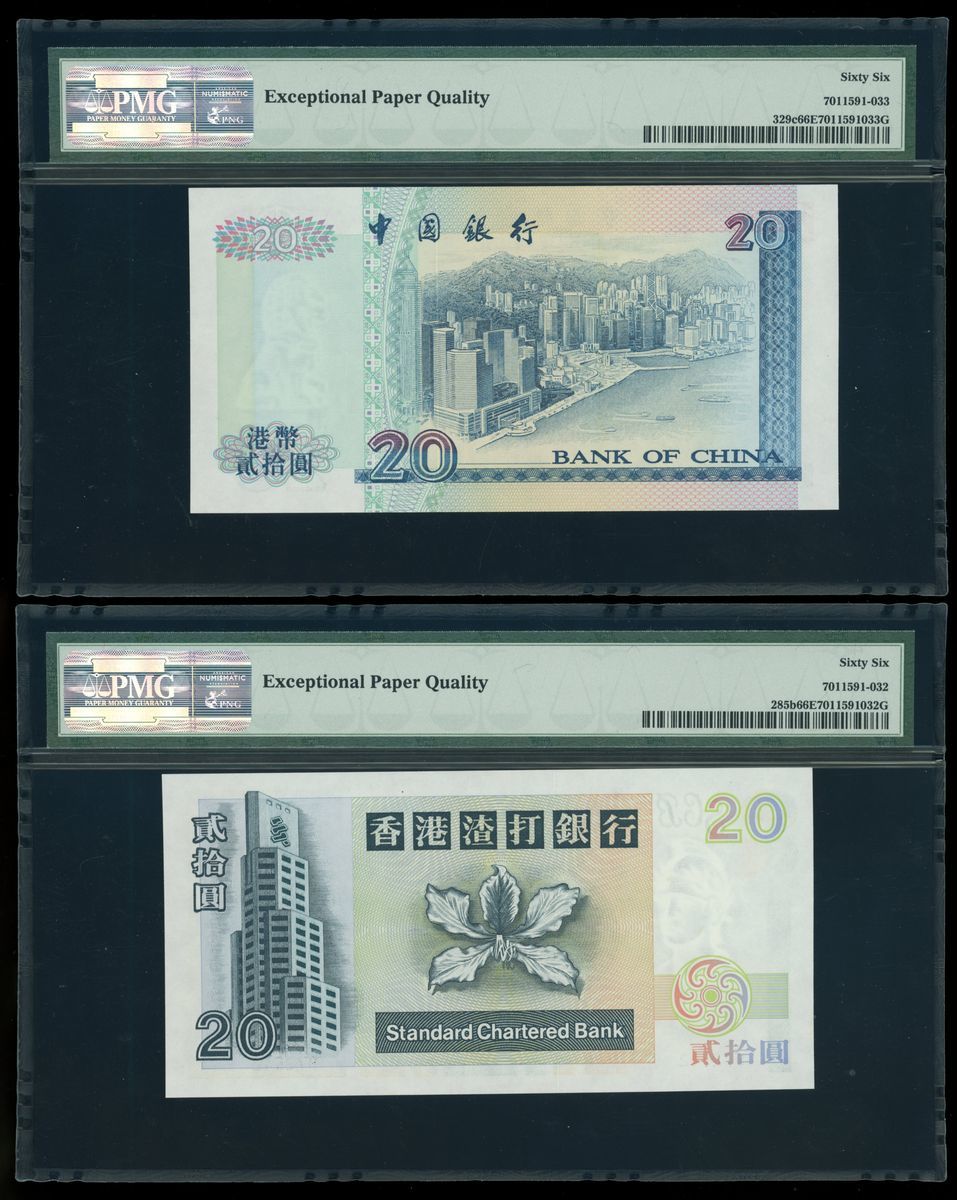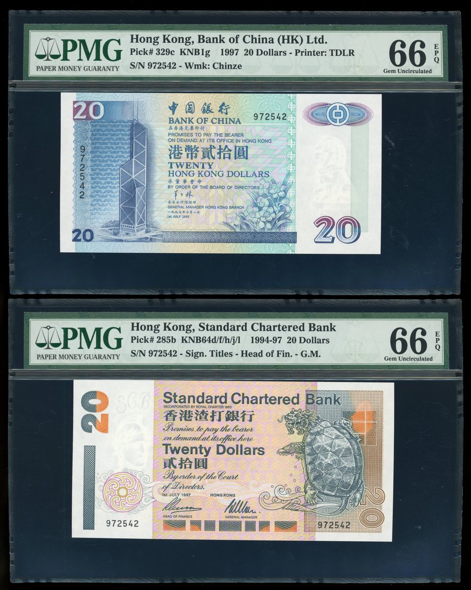 Hong Kong Banknotes, a group of 3x matching serial number 972542, $20, 1997, issued by HSBC, Standard Chartered, Bank of China, (Pick 201c, 285b, 329c), all PMG 66EPQ. An interesting group of matching serial number notes issued by different banks (3)