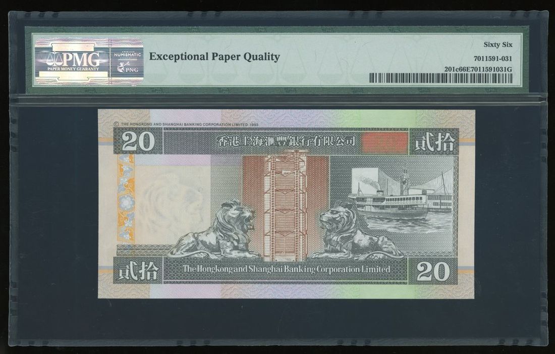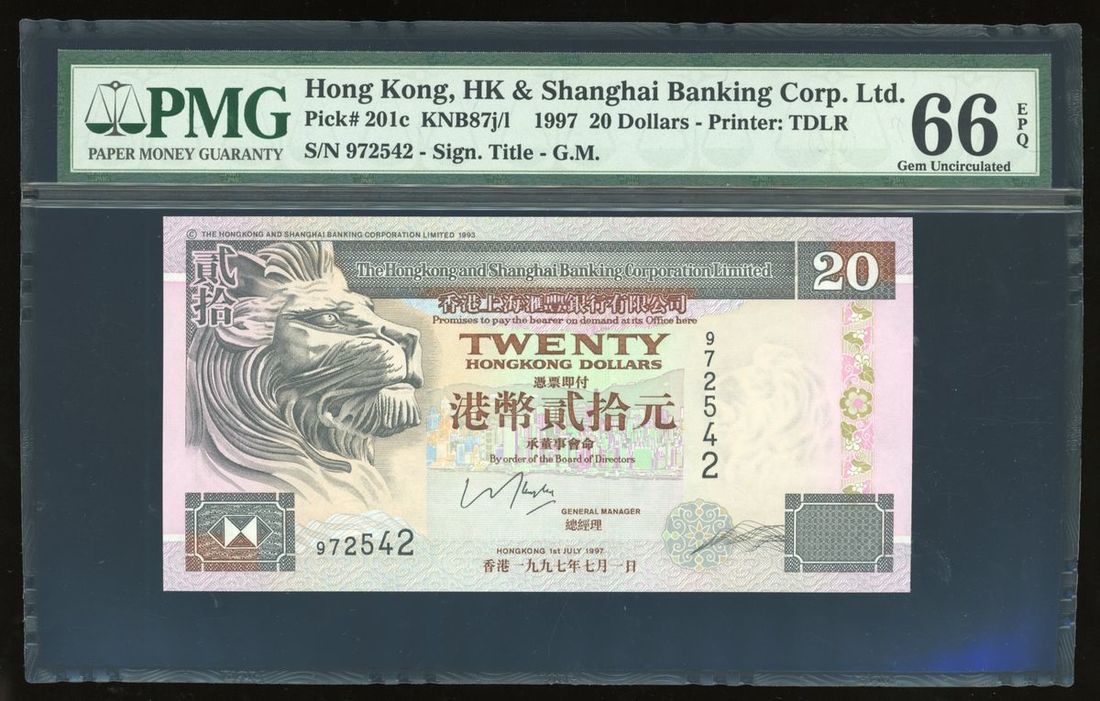1997年香港貳拾圓一組3枚,分別由三家發鈔銀行發行,相應編號972542,PMG均評66EPQ