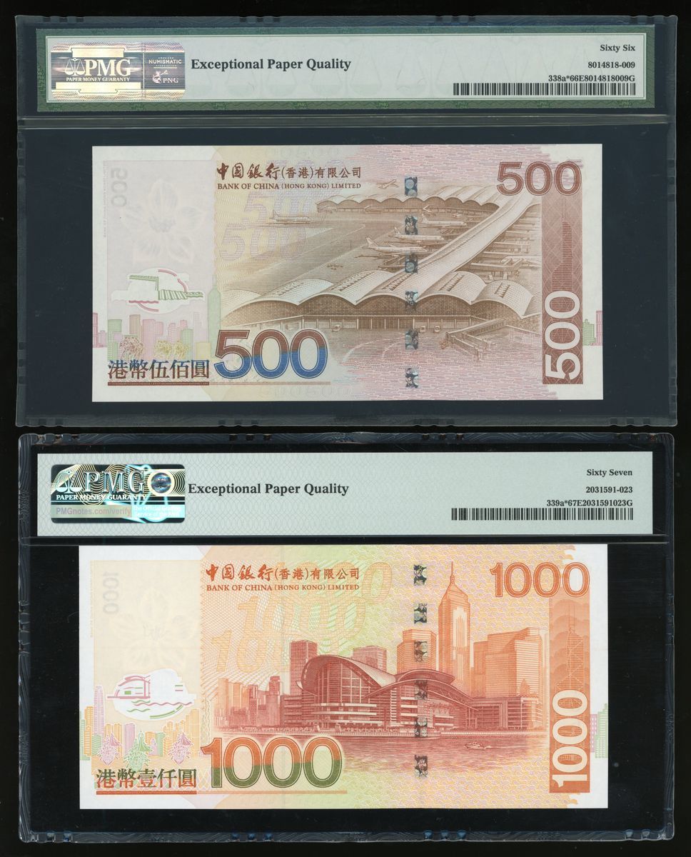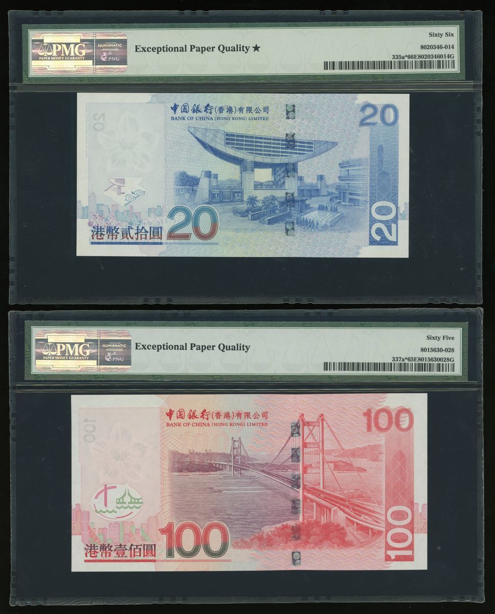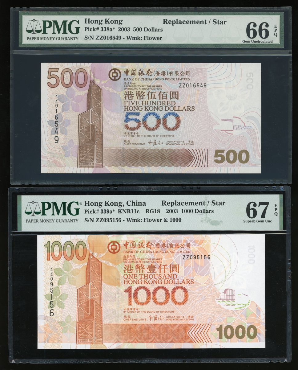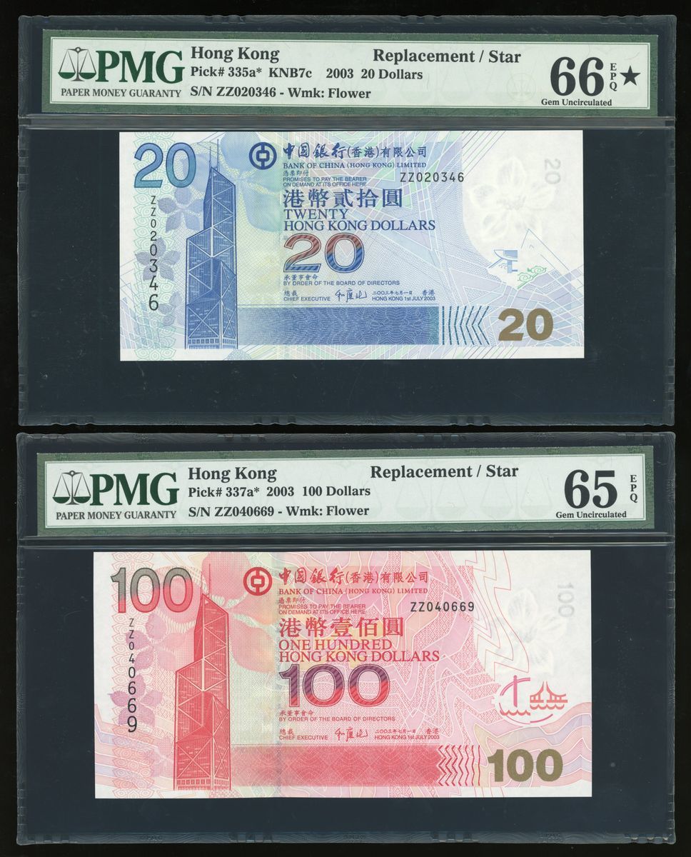 2003年中國銀行補版一組4枚,貳拾圓、壹佰圓、伍佰圓及壹仟圓,補號ZZ020346, ZZ040699, ZZ016549及ZZ095156,PMG分別評66EPQ、65EPQ、66EPQ及67EPQ