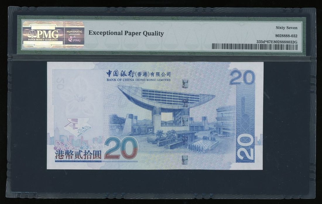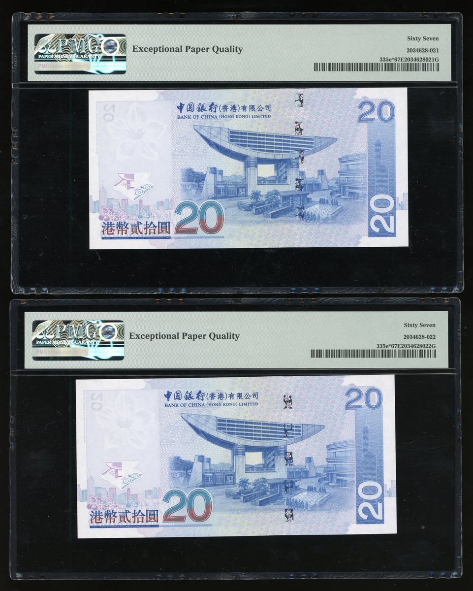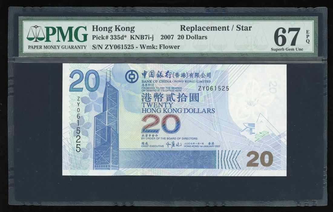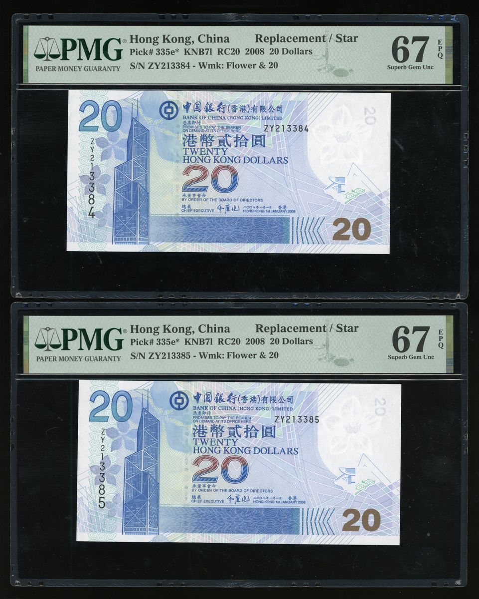 Bank of China, Hong Kong, A group of 3x replacment $20, 2007-8, serial number ZY061525, ZY213384-5 (Pick 335d*), PMG 67EPQ Superb Gem Uncirculated (3)