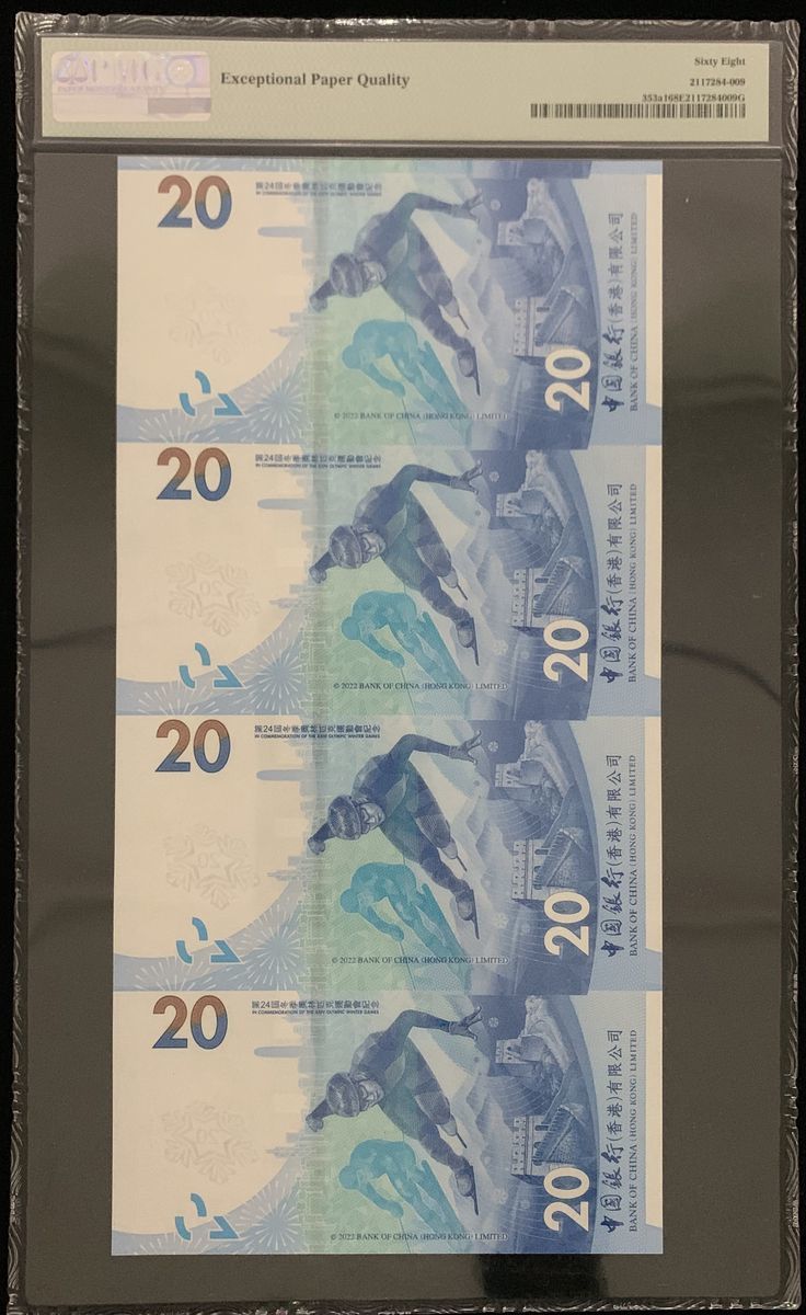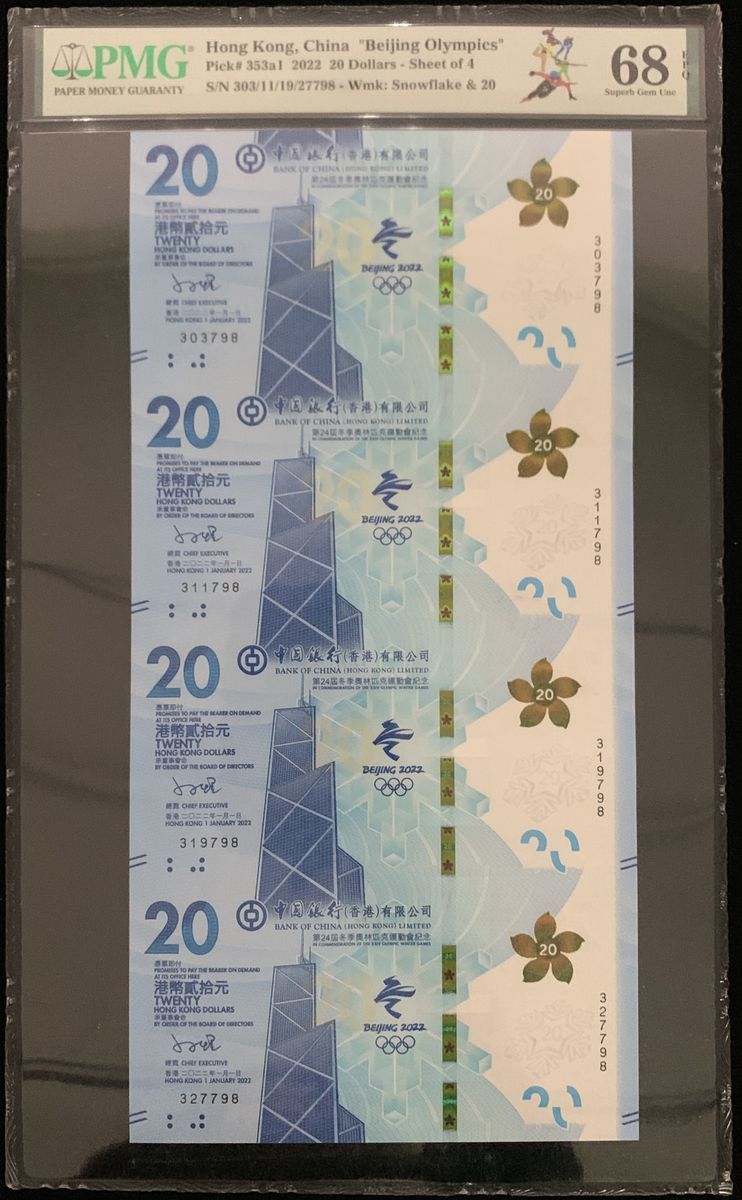 2022年中國銀行貳拾圓北京冬季奧運紀念鈔4連體,編號303/11/19/27798,PMG 68EPQ