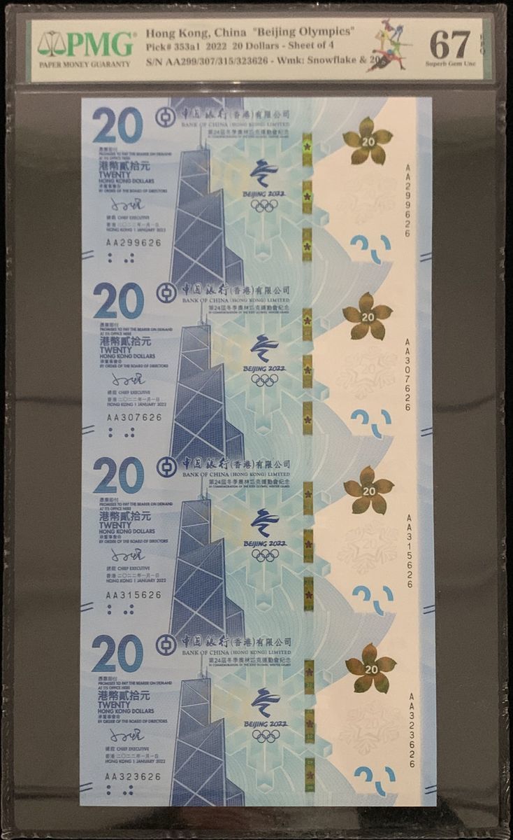 Bank of China, Hong Kong, an uncut sheet of four $20, 1.1.2022, serial number AA299/307/315/323626, '2022 Beijing Winter Olympics Commemorative',