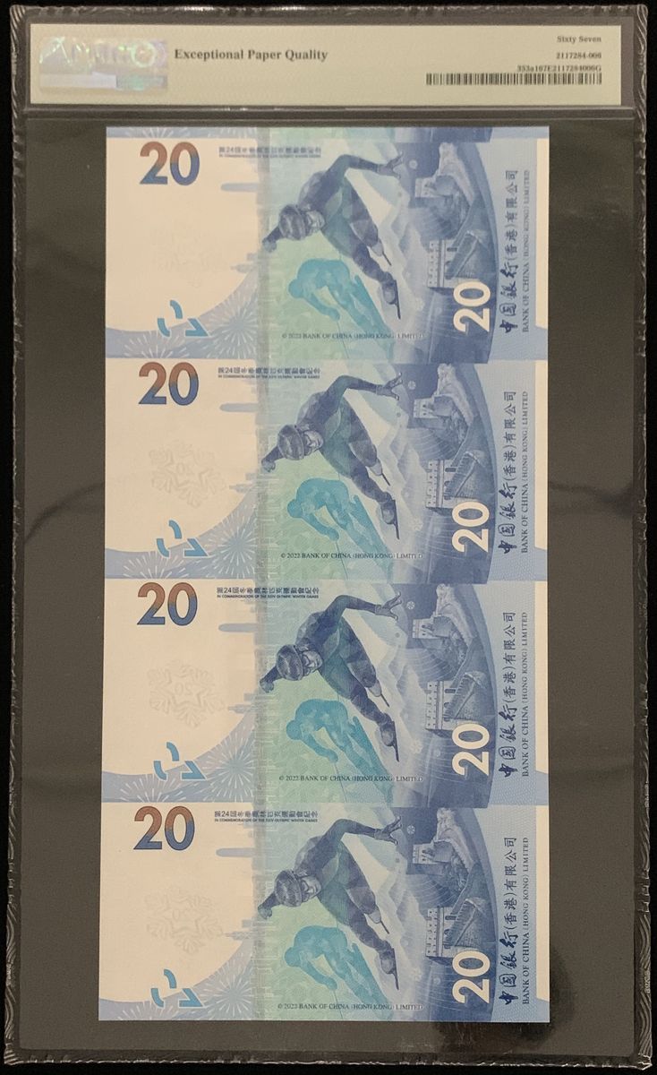 2022年中國銀行貳拾圓北京冬季奧運紀念鈔4連體,編號AA299/307/315/323626,PMG 67EPQ