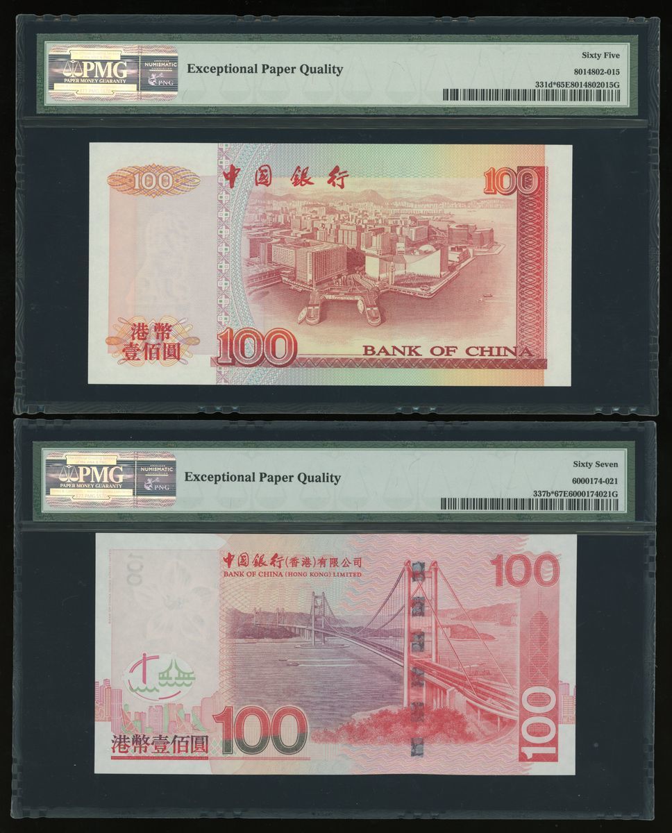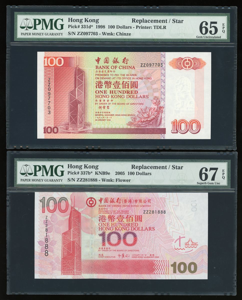 Bank of China, Hong Kong, replacement $100 (2), 1.1.1998, 1.1.2005, serial number ZZ097703, ZZ281888, (Pick 331d*, 337b*), PMG 65EPQ Gem Uncirculated, PMG 67EPQ Superb Gem Uncirculated