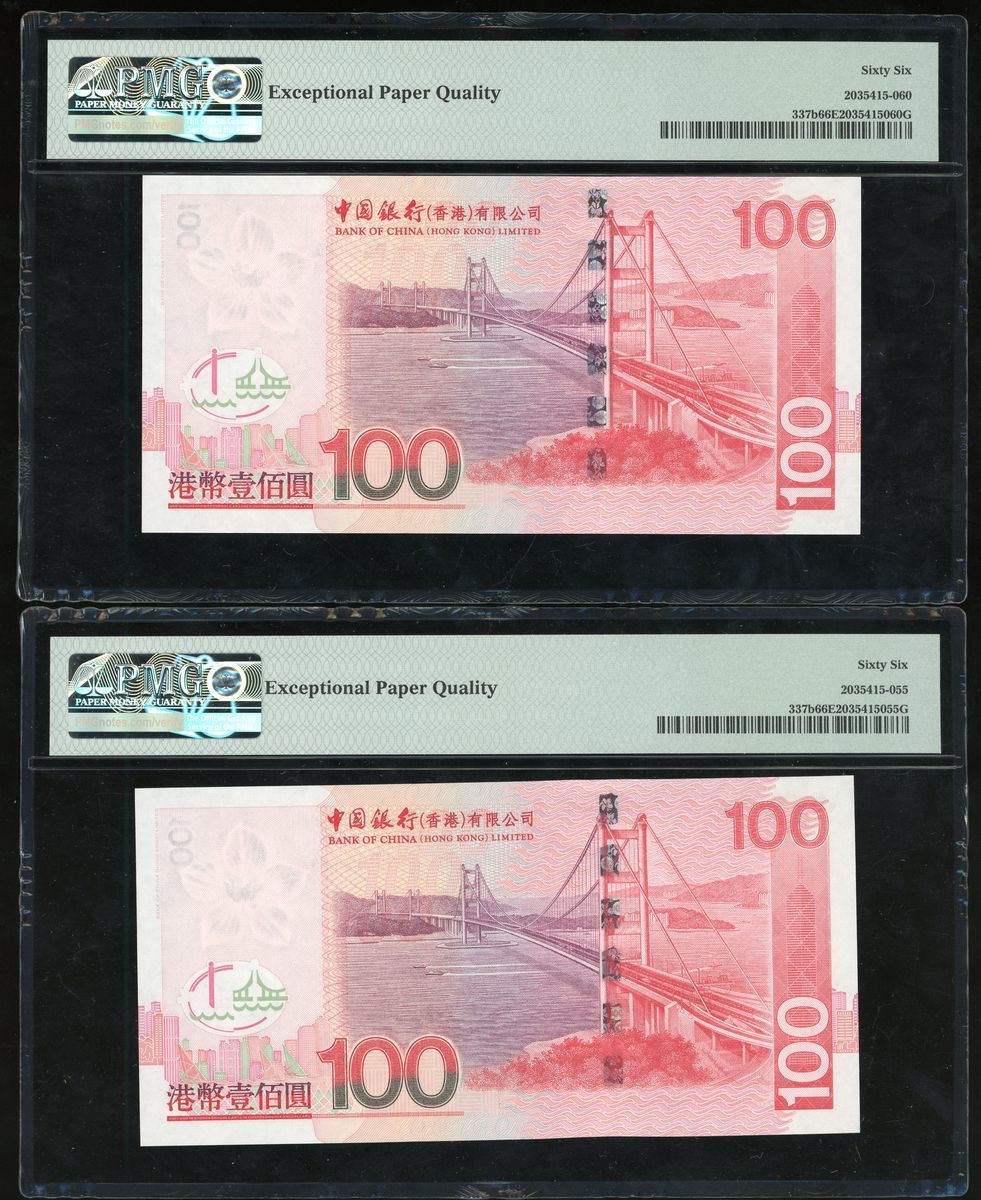 Bank of China, Hong Kong, a group of 8x $100, all with fancy number, 1.1.2005, identical prefix DL000111, DL000222, DL000444, DL000555, DL000666, DL000777, DL000888 and DL000999, (Pick 337b), "444" graded PMG 66PEQ and the rest 68EPQ (8).