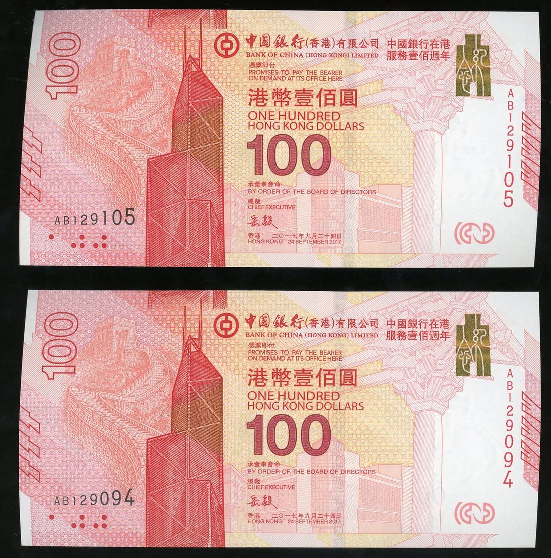 Bank of China, Hong Kong, commemorative $100 (4), 2017, serial numbers AB124076, AB129094, AB129105, BC436439, in original presentation folder, as issued (4)