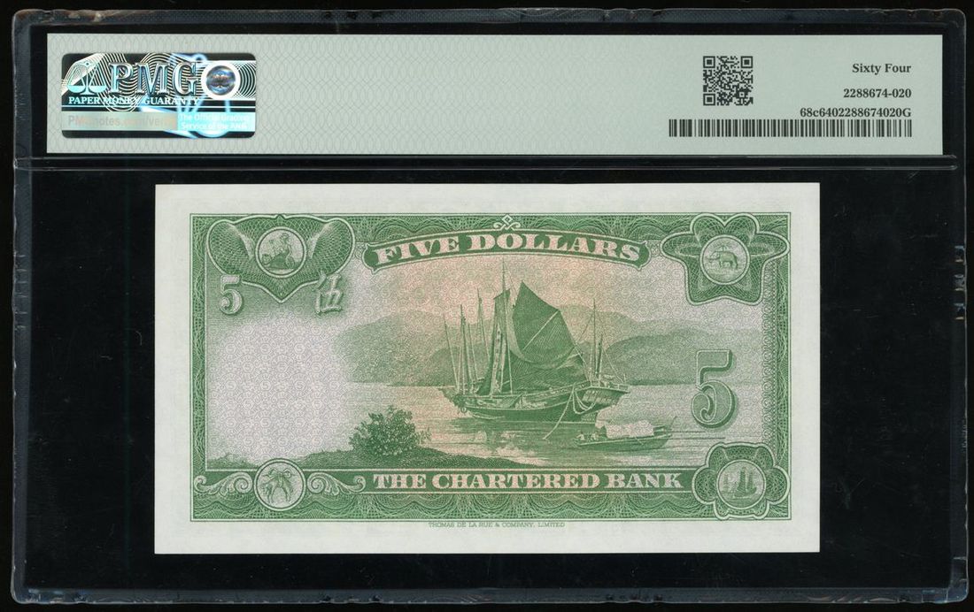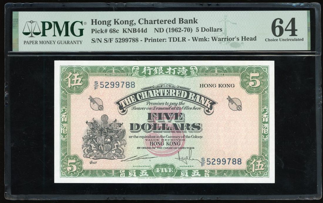 The Chartered Bank, Hong Kong, $5, ND (1962-1970), serial number S/F 5299788, (Pick 68c), PMG 64 Choice Uncirculated