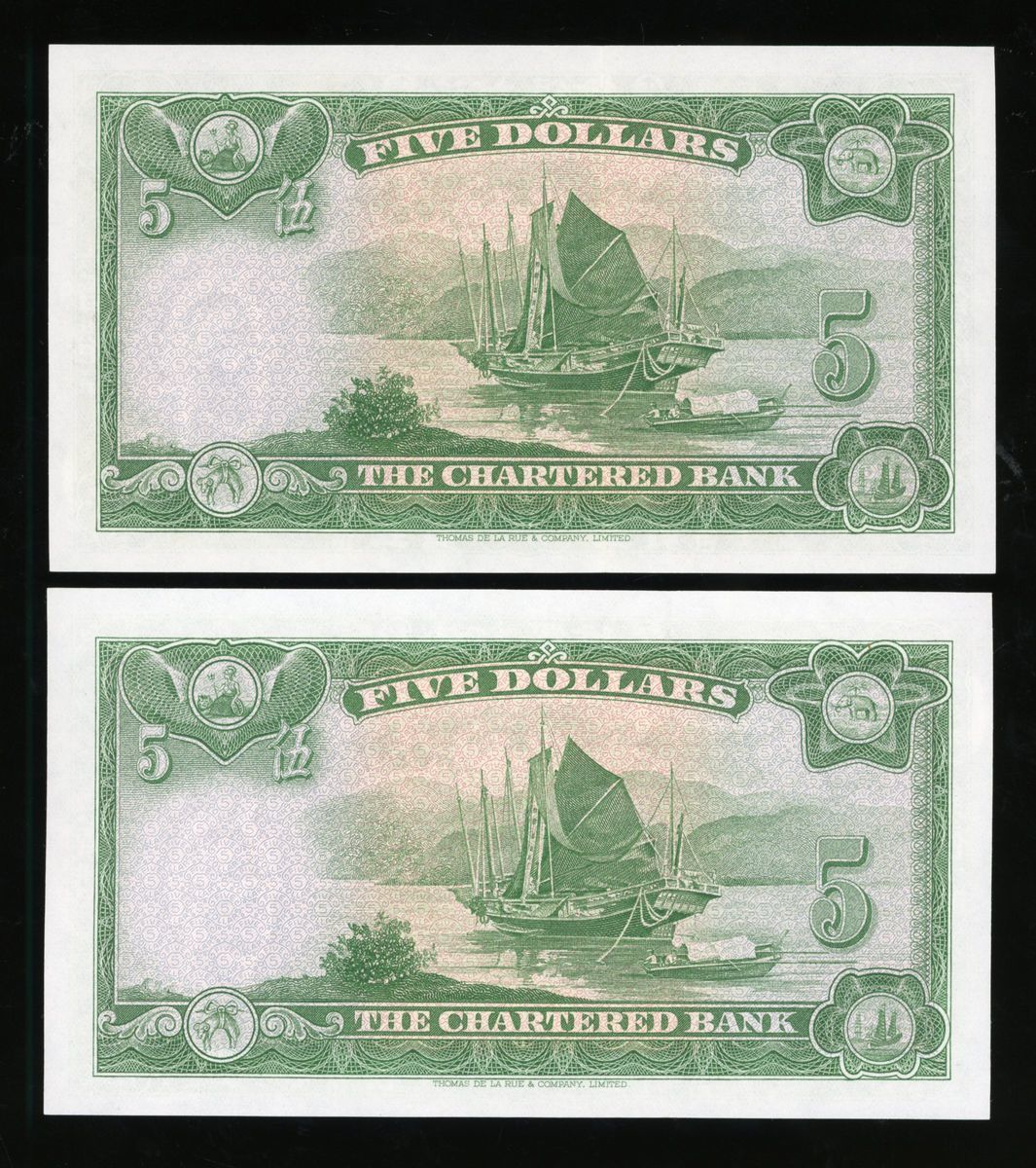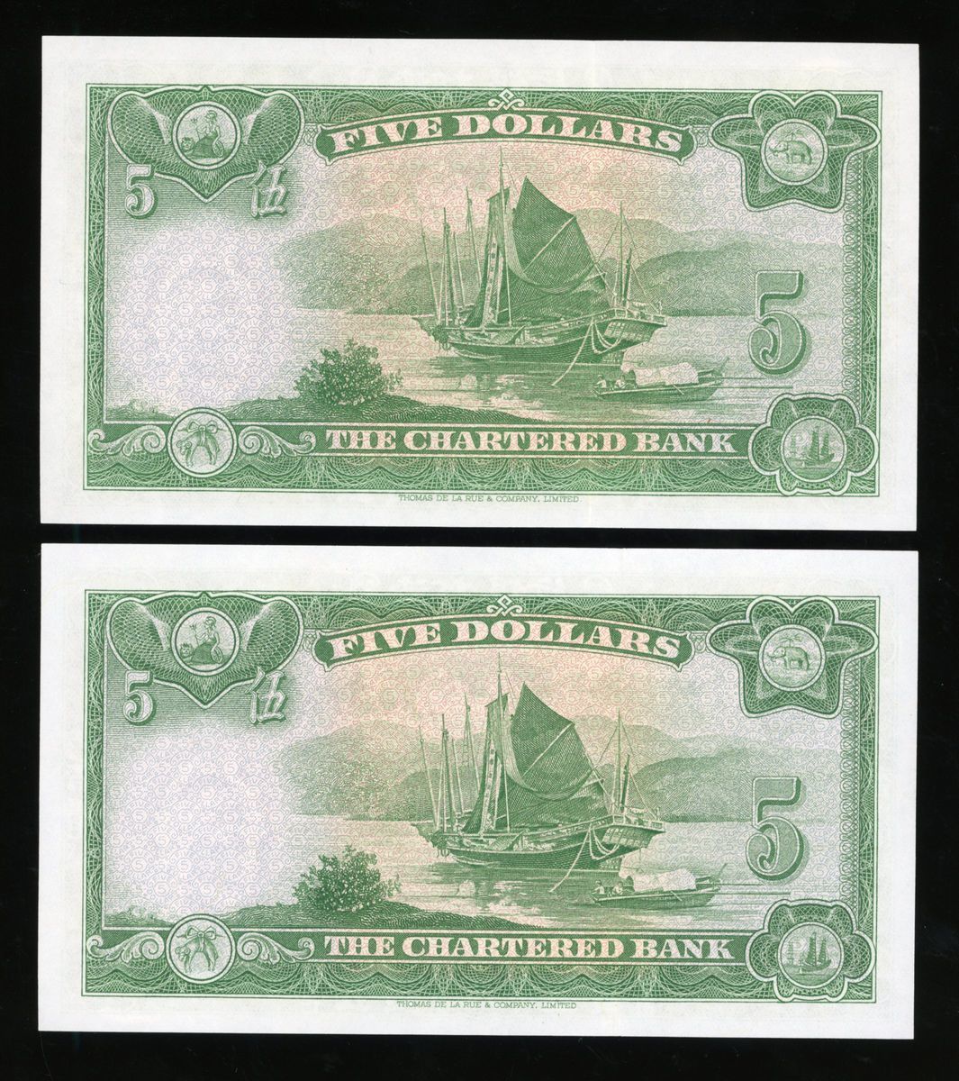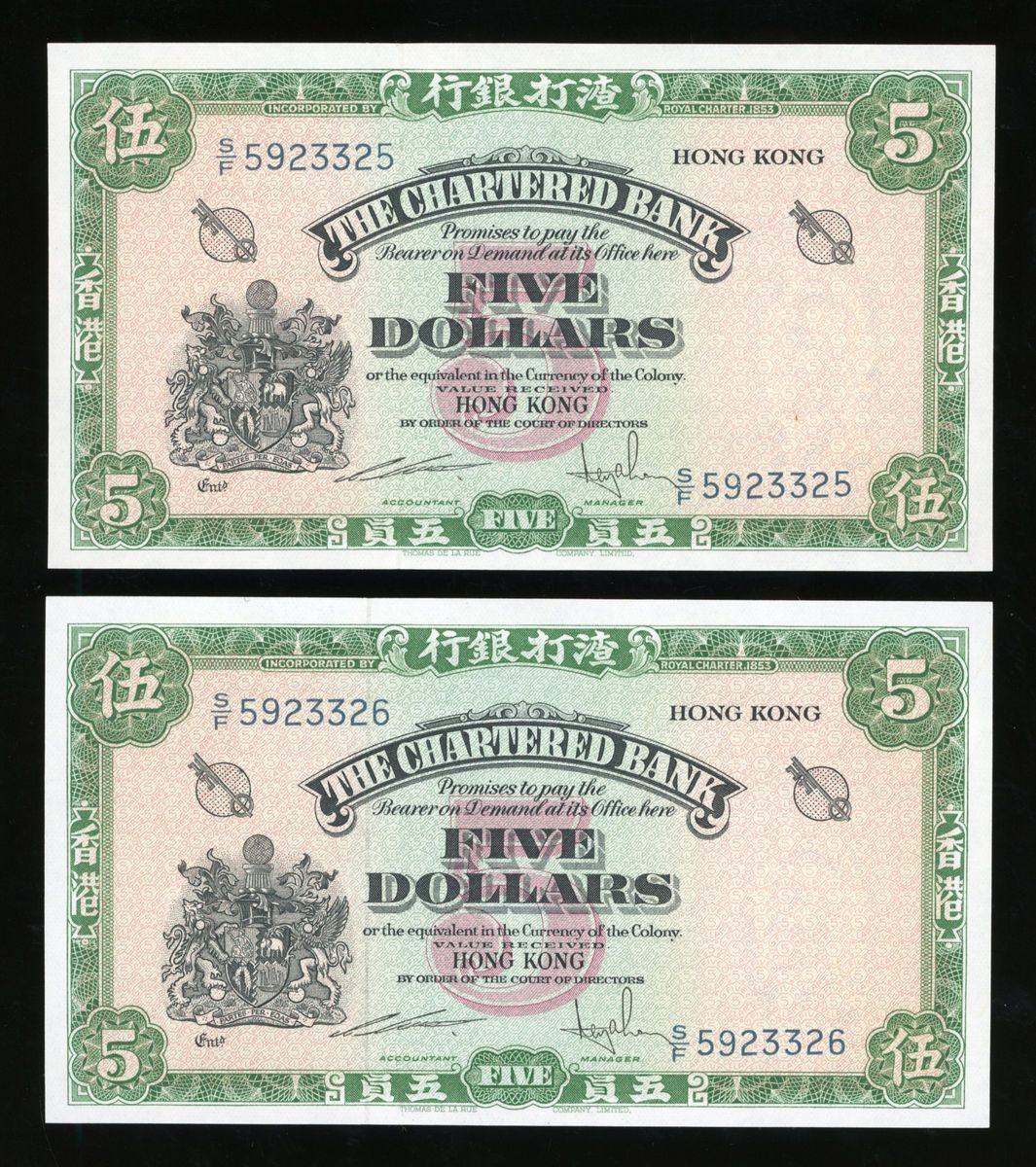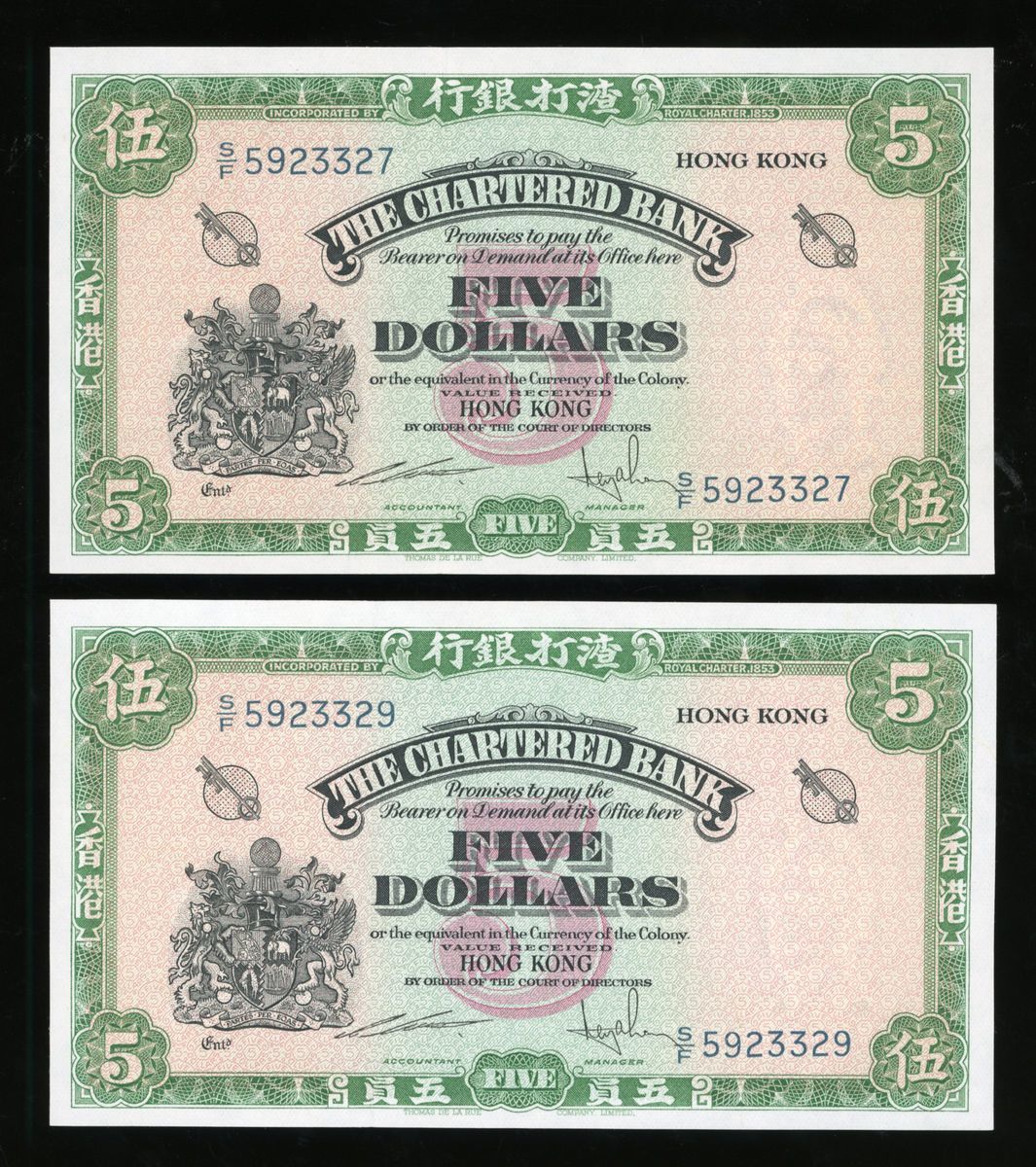 The Chartered Bank, Hong Kong, a lot of 4x $5, ND(1962-70), serial number S/F5923325-7 and S/F5923329, (Pick 68c), uncirculated.(4)
