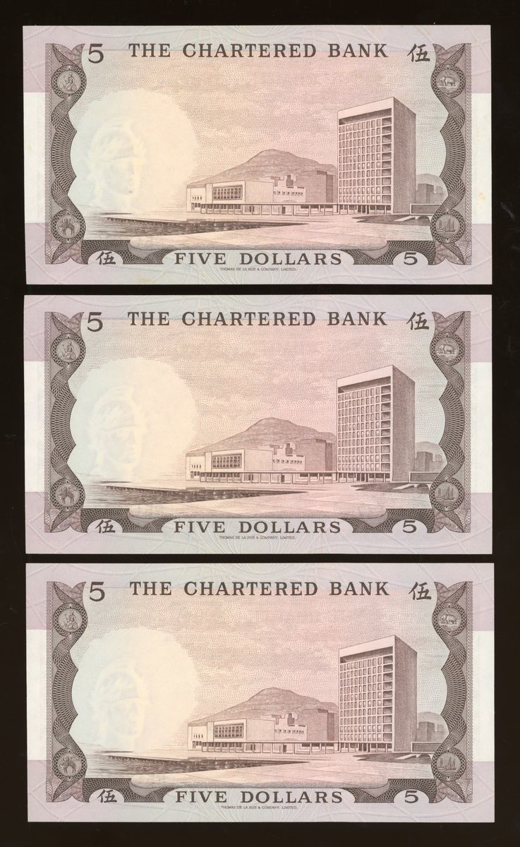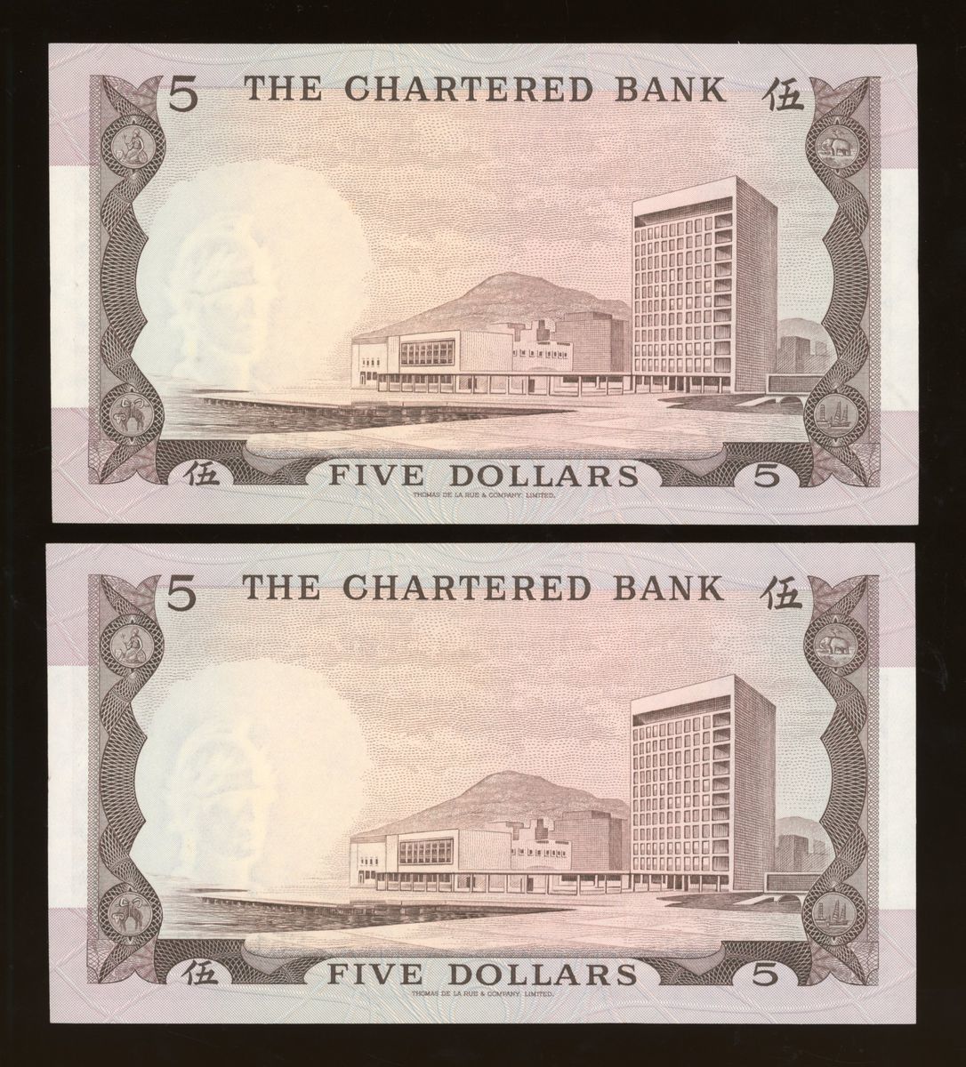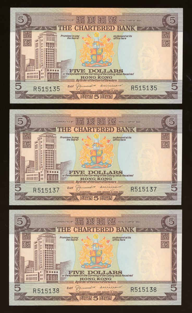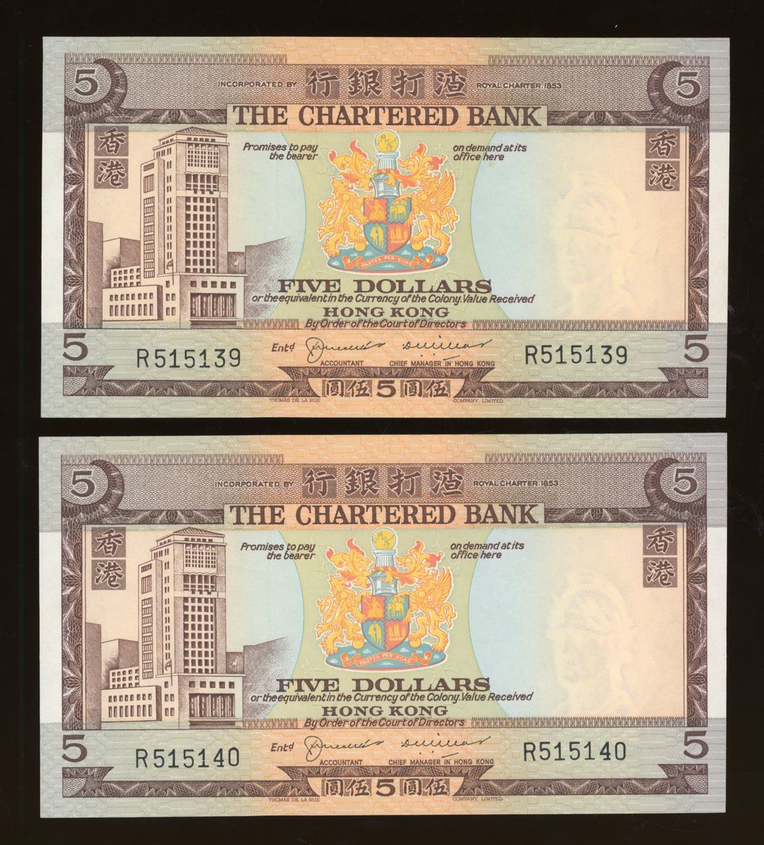 The Chartered Bank, Hong Kong, A group of 5x including, $5 (5),ND 1970-75 (5), serial numberR515135, R535137-40,